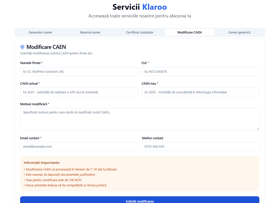 Actualizează codurile CAEN în doar câteva minute, direct din platformă – fără bătăi de cap, fără cozi, fără drumuri la Registrul Comerțului.